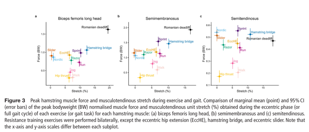 Results : The bilateral Romanian deadlift (RDL) produced significantly greater peak force in the BFlh (1.6BW,95% CI 1.5 to 1.7) and SM (1.9BW, 95% CI 1.8 to 2.1) than any other resistance training or gait task (p<0.001).