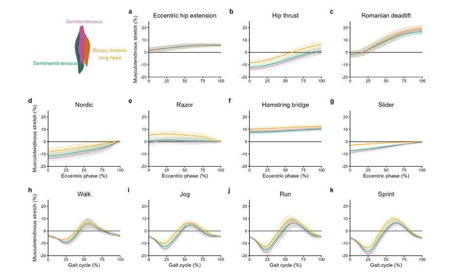 produced significantly lower stretch than any other task (p<0.001), except the hip thrust for the ST (p≥0.143).